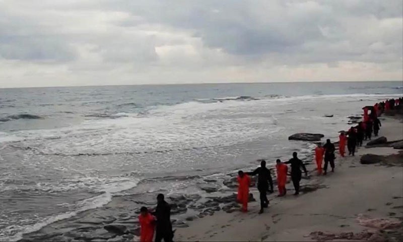 فوٹیج میں ہتھکڑیوں کے ساتھ نارنجی جمپ سوٹ میں ملبوس مصری مغویوں کو سیاہ لباس پہنے داعش کے جنگجوکی جانب سے قتل کرتے ہوئے دکھایا گیا۔