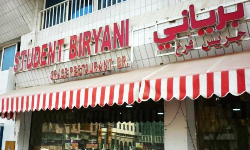 جب آپ ابو ظہبی کے ٹورسٹ کلب ایریا میں اسٹوڈنٹ بریانی تک پہنچیں، تو سرخ رنگ کا ایک چمکدار 'اسٹوڈنٹ بریانی' سائن آپ کا استقبال کرتا ہے جس کے نیچے سرخ و سفید چھتری موجود ہے۔ یہ بہت زیادہ فینسی جگہ نہیں، دو منزلہ عمارت کسی اور دور کی لگتی ہے جیسے اسے بنایا ہی اس مقصد کے لیے گیا ہو کہ وہ آپ کو گزرے وقت میں واپس لے جائے۔