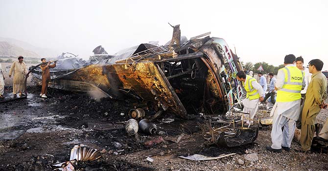 ذرائع کے مطابق، دھماکے کے بعد بس میں رکھے گیس سلنڈر پھٹنے کی وجہ سے بس میں آگ لگ گئی۔