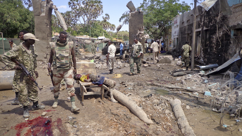 عینی شاہدین نے بتایا کہ دھماکے کی جگہ لاشیں بکھری پڑی ہیں،حملے کی زمہ داری القاعدہ سے تعلق رکھنے والے گروہ شباب نے قبول کی ہے۔