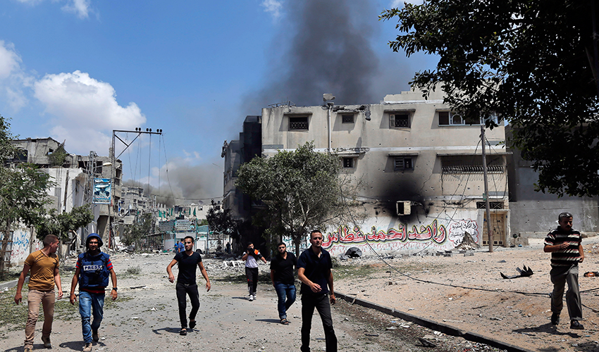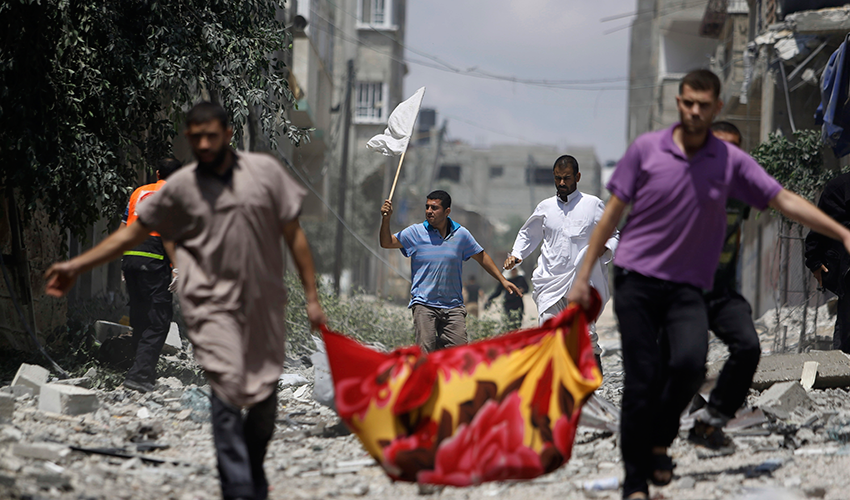 غزہ شہر اور اسرائیلی سرحد کے درمیان واقع شجائیہ میں میں اسرائیلی فوج کی جانب سے حماس پر لگائے گئے فائرنگ کے الزام کے چند 40 منٹ بعد ایک عمارت حملے کے باعث زمین بوس ہو گئی اور رضاکار لاشوں کو ملبے سے نکالنے میں مصروف ہو گئے۔