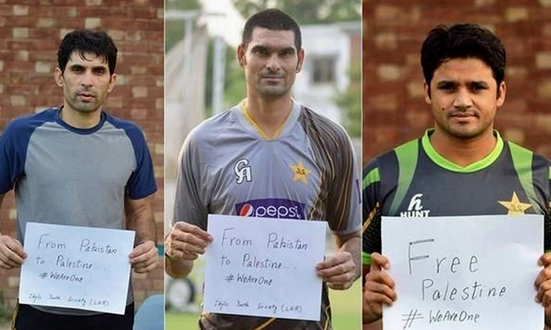 اس معاملے میں پاکستانی کرکٹرز بھی کسی سے پیچھے نہیں اور مختلف کھلاڑیوں نے فری فلسطین کے پلے کارڈز اٹھا کر غزہ کے متاثرین سے یکجہتی کا اظہار کیا ہے، ان کرکٹرز میں کپتان مصباح الحق سمیت دیگر شامل تھے۔