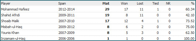 تاہم ٹی ٹوئنٹی میچز میں شاہد آفریدی کی کپتانی کا ریکارڈ زیادہ اچھا نہیں، اب تک انہوں نے انیس میچز میں قومی ٹیم کی قیادت کی جس میں سے پاکستان صرف آٹھ ہی جیت سکا جبکہ گیارہ میں شکست کا سامنا کرنا پڑا۔
