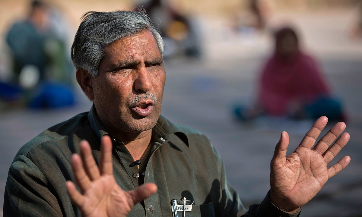 | اٹھارہ مارچ کی اس تصویر میں محمد ایوب غریب بچوں کو پڑھا رہے ہیں— اے پی فوٹو |