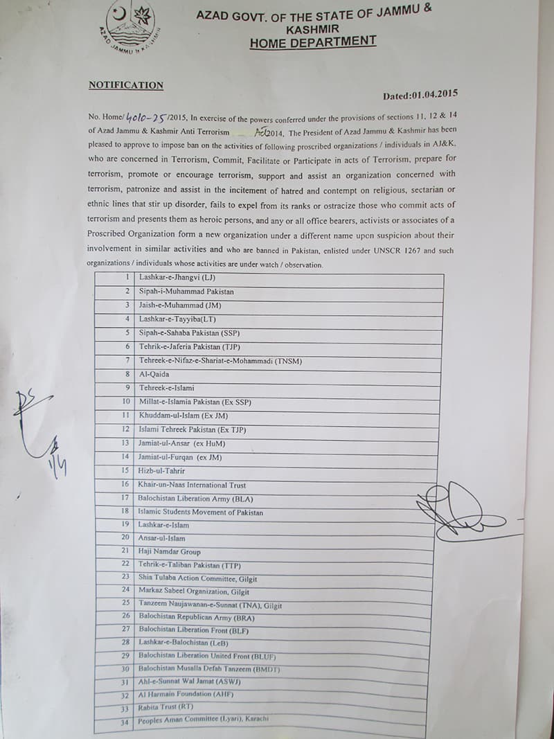 نوٹیفکیشن میں آزاد کشمیر میں کسی بھی فرد یا گروہ کو ممنوعہ قرار دی گئی ان تنظیموں کے ساتھ تعاون کرنے سے منع کیا گیا ہے۔