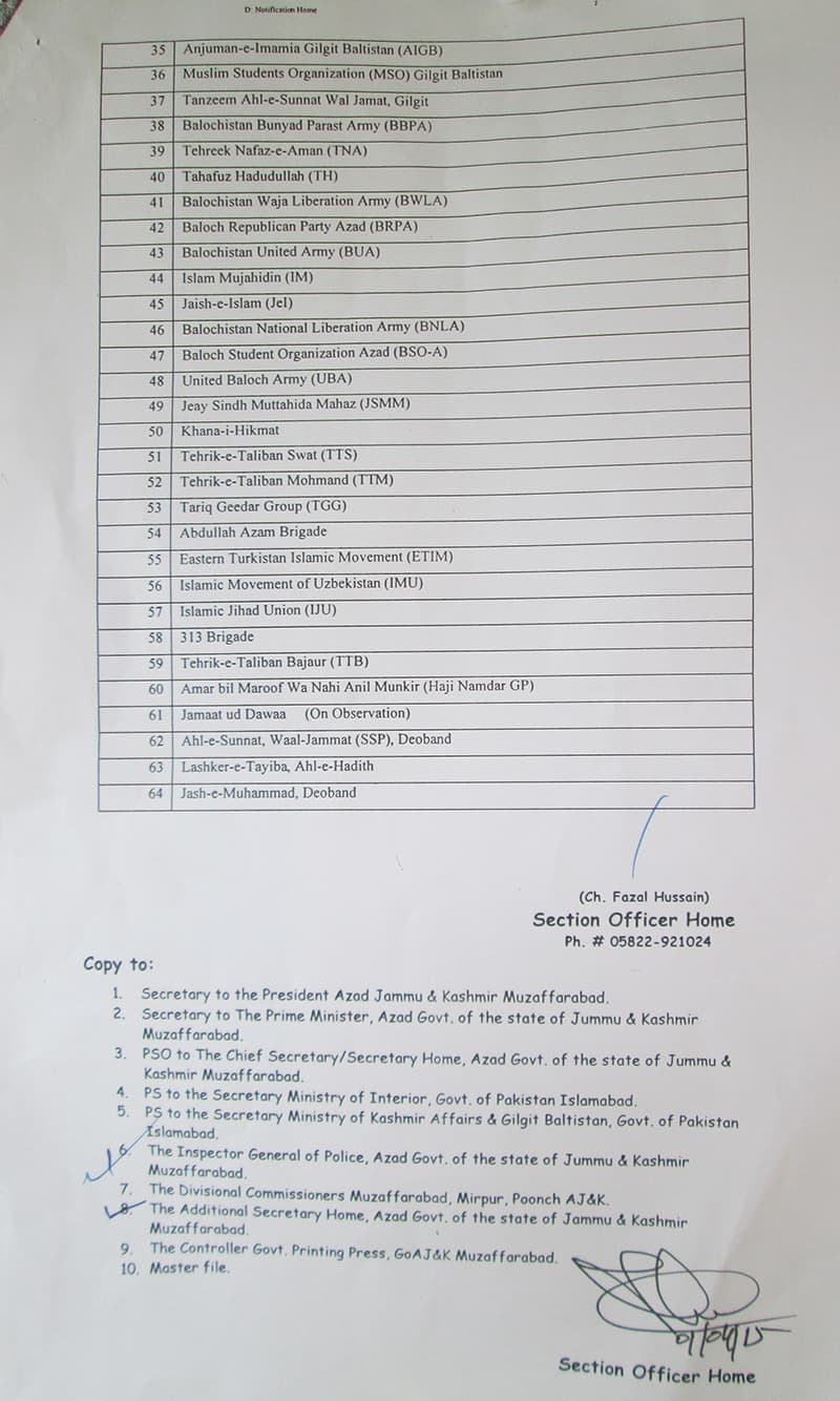 جمعرات کو محکمہ داخلہ آزاد کشمیر کی جانب سے انسداد دہشت گردی ایکٹ 2014 کے تحت 63 تنظیموں کی آزاد کشمیر کی حدود میں سرگرمیوں پر پابندی عائد کرنے کا نوٹیفیکیشن جاری کیا گیا۔
