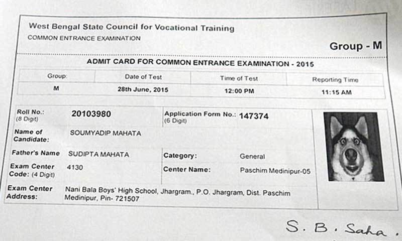 ہندوستان ٹائمز کی رپورٹ کے مطابق ریاست مغربی بنگال کے شہر مدنا پور میں ایک طالب علم سومیا دیپ ماہتو نے انڈسٹریل ٹریننگ انسٹیٹیوٹ میں داخلہ ٹیسٹ کے لیے جب اپنا ایڈمٹ کارڈ ادارے کی ویب سائٹ سے ڈاؤن لوڈ کیا تو وہاں اس کی تصویر کی جگہ کتے کی تصویر تھی۔