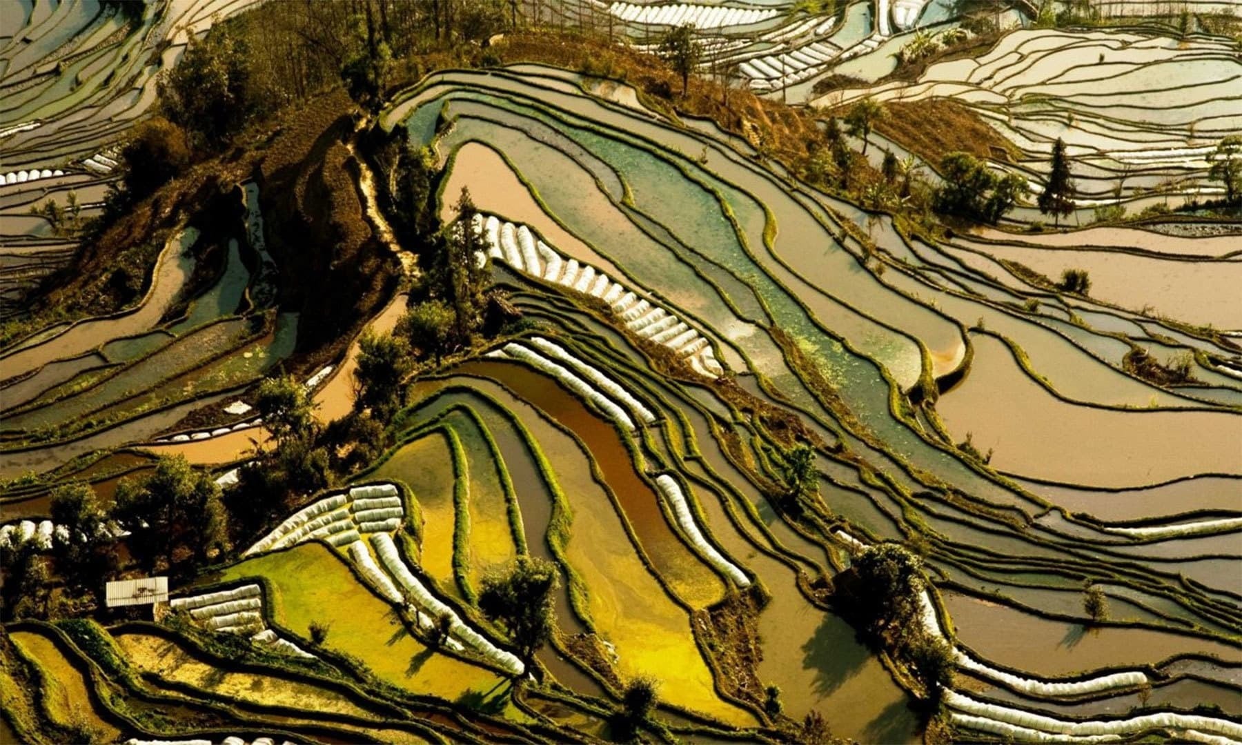 دنیا بھر میں مصوروں کی آڑھی ترچھی کھینچی گئی لائنوں کو ہوسکتا ہے آپ نے کبھی کینوس پر دیکھا ہو مگر قدرت نے بھی اک جگہ کچھ ایسا ہی زبردست نقشہ بنایا ہے جس کو دیکھ کر اپنی آنکھوں پر یقین کرنا مشکل ہوجاتا ہے۔ یہ ہے چینی صوبے یوننان میں واقع چاول یا دھان کے کھیتوں کا منظر جو کسی مصور کے برش کا کمال لگتے ہیں۔
