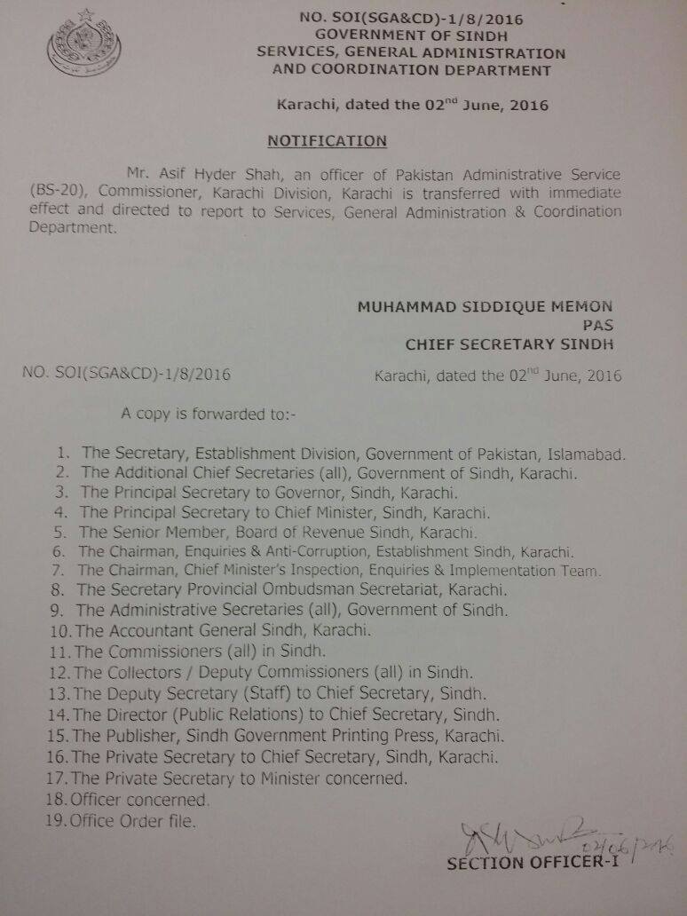 واضح رہے کہ عمومی طور پر کراچی کا کمشنر گریڈ 21 کے افسر کو بنایا جاتا تھا مگر گریڈ 20 کے افسر آصف حیدر شاہ کو کمشنر بنایا دیا گیاتھا.
