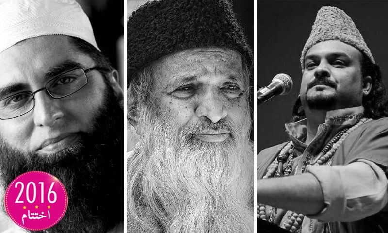 امجد صابری کو 22 جون 2016 میں کراچی علاقے لیاقت آباد میں نامعلوم مسلح افراد نے گولیوں کا نشانہ بنا کر قتل کیا، جبکہ اس واقعہ کے صرف 16 روز کے بعد یعنی 9 جولائی کو انسانیت کے خادم سماجی کارکن عبدالستار ایدھی طویل علالت کے بعد 88 برس کی عمر میں انتقال کر گئے، جبکہ سال کے آخری مہینے میں 7 دسمبر کو ملک کے ہر دل عزیز اور معروف نعت خواں جنید جمشید چترال سے اسلام آباد آنے والے پاکستان انٹرنیشنل ایئر لائنز(پی آئی اے) کے بدقسمت طیارے کے حادثے میں اپنی اہلیہ کے ہمراہ سفرِ آخرت پر روانہ ہوئے۔