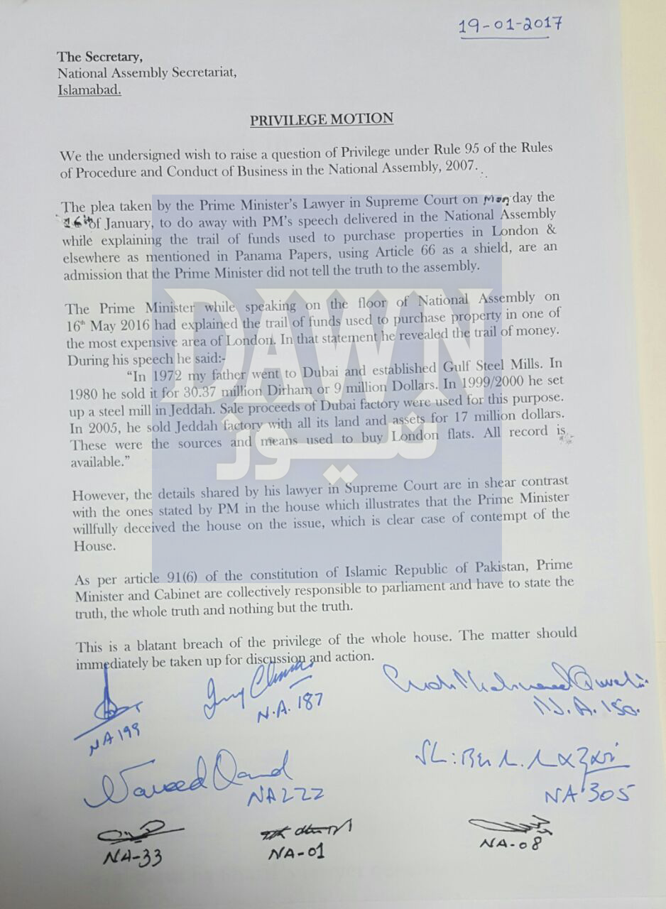 وزیراعظم کے خلاف جمع کرائی گئی تحریک استحقاق پر قائد حزب اختلاف خورشید شاہ کے علاوہ پاکستان تحریک انصاف (پی ٹی آئی) رہنما شاہ محمود قریشی، شیریں مزاری، قومی وطن پارٹی کے آفتاب شیر پاؤ، پاکستان پیپلز پارٹی (پی پی پی) کے نوید قمر، جماعت اسلامی کے صاحبزادہ طارق اللہ، عوامی نیشنل پارٹی (اے این پی) کے غلام احمد بلور نے دستخط کیے۔