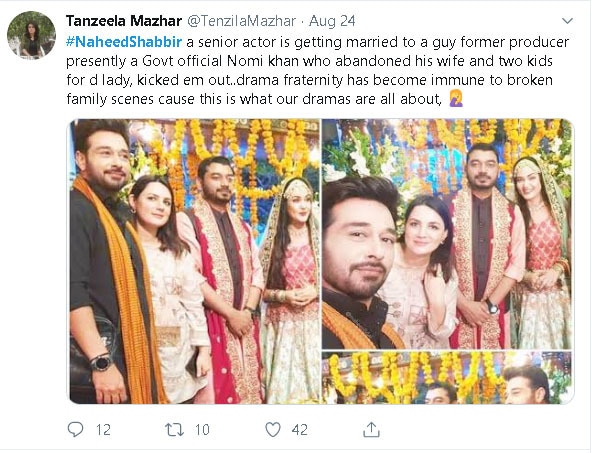 تنزیلہ مظہر نامی صحافی نے اپنی ٹوئٹ میں لکھا کہ 'سینئر اداکارہ ناہید شبیر نے اپنے سابق پروڈیوسر اور سرکاری افسر کے ساتھ شادی کی، جنہوں نے اپنی اہلیہ اور 2 بچوں کو ان کی خاطر ترک کردیا، گھر سے نکال دیا، ڈرامہ انڈسٹری کو اس بات سے فرق نہیں پڑتا، کیوں کہ ہمارے ڈراموں میں یہی سب تو دکھایا جاتا ہے'۔