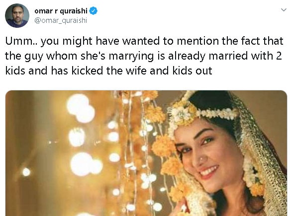 ایک اور صارف نے اپنی ٹوئٹ میں لکھا کہ 'اس بات کا ذکر بھی ہونا چاہیے کہ ناحید ایک ایسے شخص سے شادی کررہی ہیں جو پہلے سے شادی شدہ ہے اور اس کے دو بچے بھی ہیں، جن کو انہوں نے چھوڑ دیا ہے'۔