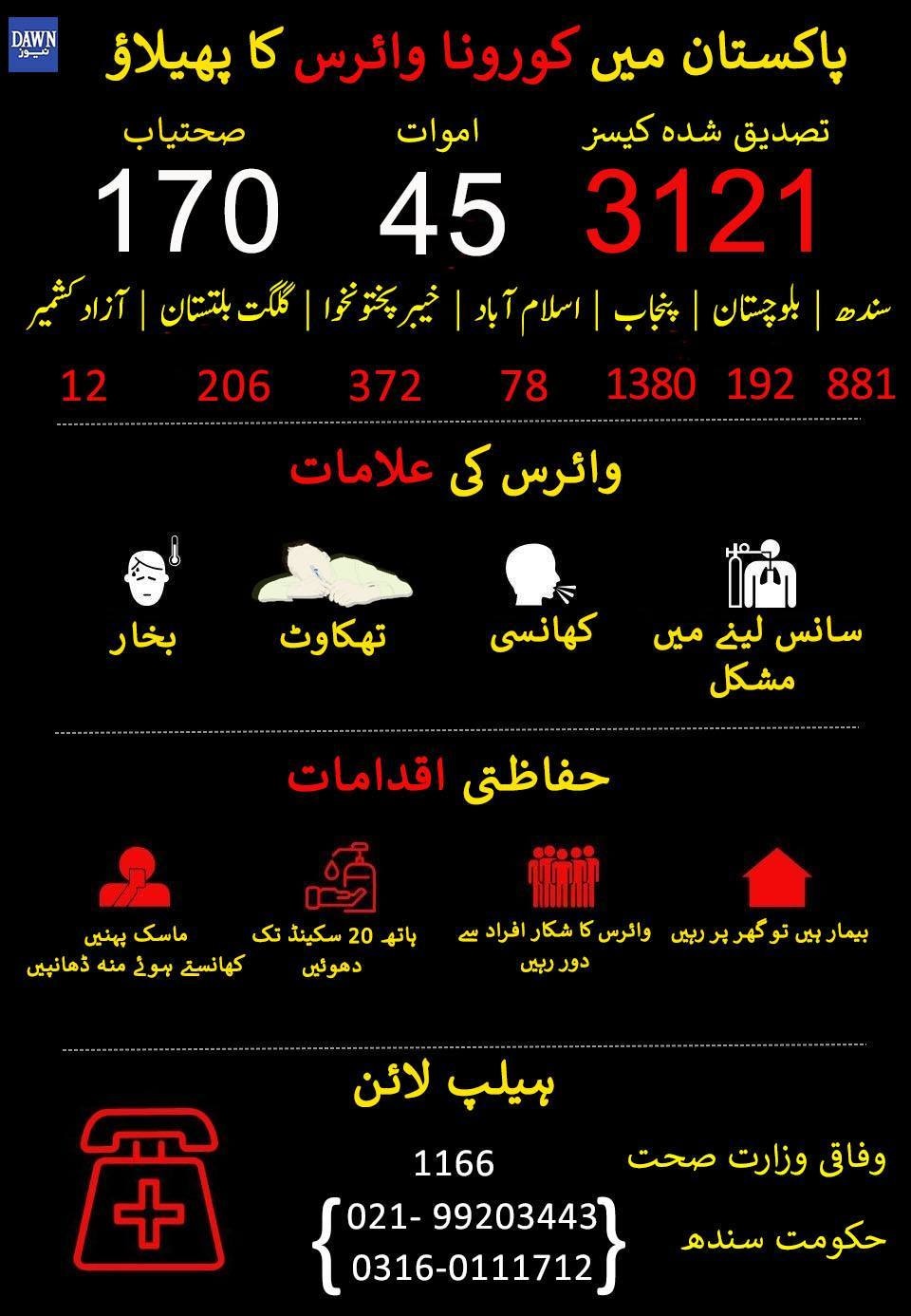 خیال رہے کہ پاکستان میں کورونا وائرس کے مریضوں کی مجموعی تعداد 3 ہزار ایک سو 21 ہوگئی ہے۔