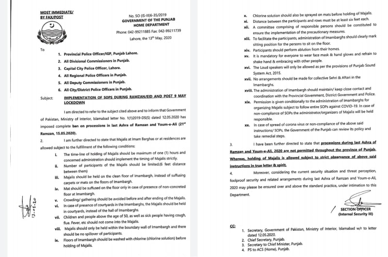حکومت پنجاب نے یوم علی جلوس پر پابندی کا نوٹی فکیشن جاری کردیا
