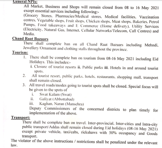 - 8 سے 16 مئی تک بین الصوبائی، انٹرسٹی اور انٹراسٹی پبلک ٹرانسپورٹ بدستور بند رہے گی۔