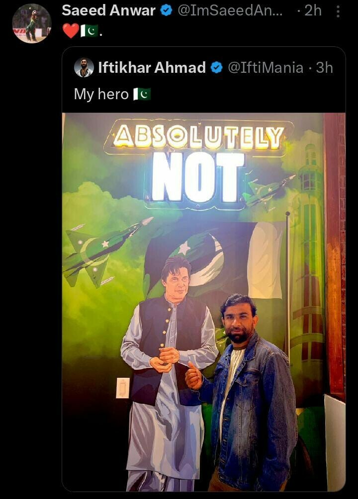 اس پوسٹ پر دعمل دیتے ہوئے قومی کرکٹ ٹیم کے سابق کھلاڑی کی جانب سے بھی افتخار احمد کے پوسٹ کو ری پوسٹ کرتے ہوئے پاکستان کا جھنڈا شئیر کیا گیا ہے۔