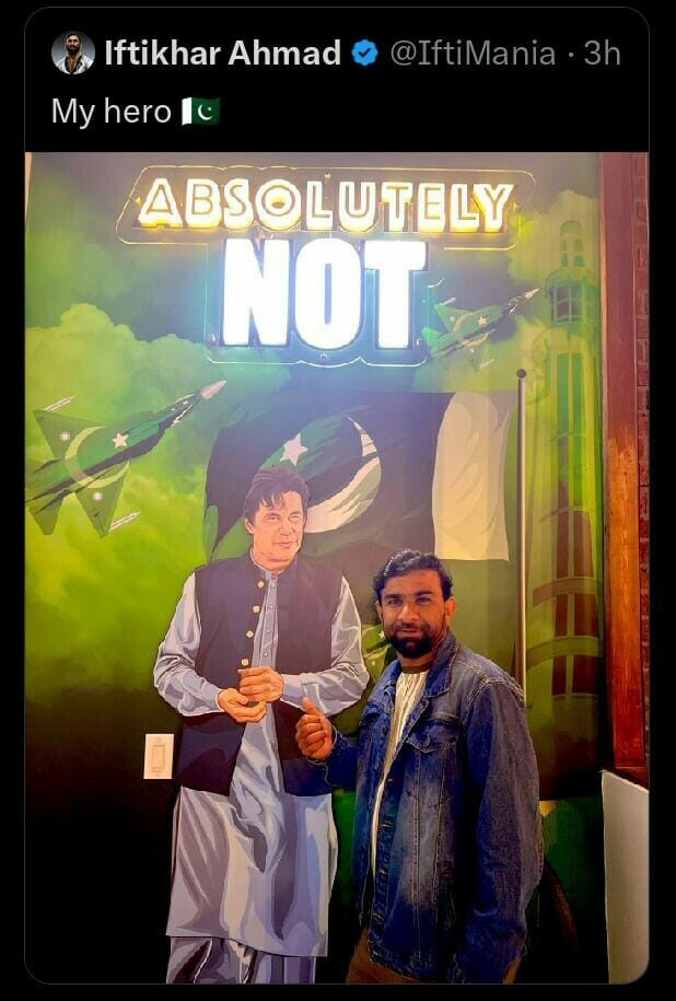 ایکس پر کرکٹر افتخار احمد کی جانب سے پوسٹ کیا گیا تھا، جس میں ایک تصویر موجود تھی، اس تصویر میں سابق وزیر اعظم اور پاکستان تحریک انصاف کے بانی عمران خان، پاکستان کا جھنڈا اور جے ایف 17 تھنڈر دکھائی دے رہا تھا۔