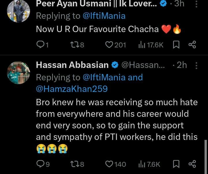 جبکہ ایکس صارفین نے ’چاچا‘ کو فیورٹ بھی قرار دے دیا ہے، ایک صارف نے لکھا کہ اب سے آپ فیورٹ چاچا ہو، لیکن ایک صارف نے لکھا بھائی کو معلوم ہے کہ انہیں ہر جگہ سے شدید تنقید کا نشانہ بنایا جا رہا ہے، اور ان کا کیرئیر بھی جلد ختم ہو سکتا ہے، تو ہمدردیاں اور پاکستان تحریک انصاف کے حامیوں کی حمایت حاصل کرنے کے لیے ایسا کیا۔