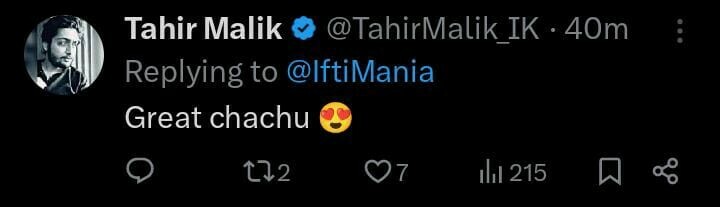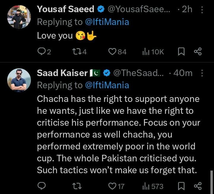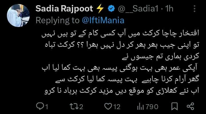 طاہر ملک نامی ایکس صارف نے لکھا کہ ’گریٹ چاچو‘۔ تاہم سعدیہ راجپوت نامی ایکس صارفہ نے الزام عائد اور تنقید کرتے ہوئے لکھا کہ افتخار چاچاکرکٹ میں آپ کسی کا کے توہیں نہیں، تو اپنی جیب بھر بھر کر دل نہیں بھرا؟ کرکٹ تباہ کردی ہماری تم جیسوں نے، آپ کی عمر بہت ہوگئی پیسہ بھی بہت کما لیا اب گھر آرام کرنا چاہیے۔