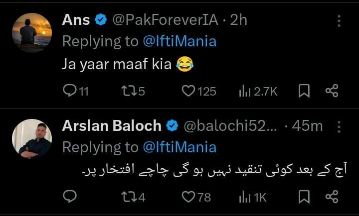 کچھ ایکس صارفین نے اسے تفریح کا ذریعہ بھی بنایا، ایک صارف نے لکھا کہ جا یار! معاف کیا، جبکہ ایک اور صارف نے لکھا کہ ’آج کے بعد کوئی تنقید نہیں ہوگی، چاچے افتخار پر‘۔
