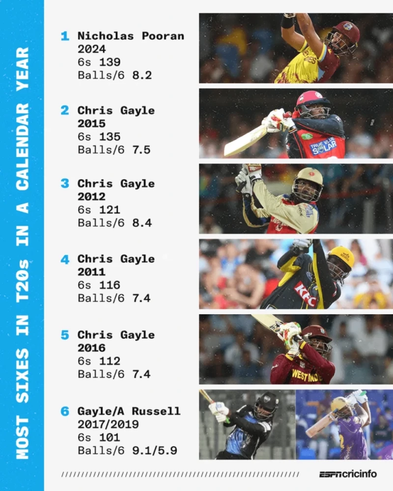 کرس گیل نے سال 2015 میں ٹی20 میں ایک ہزار 12 گیندوں کا سامنا کرتے ہوئے (7.50 بال پر سکس) کی اوسط سے 135 چھکے لگائے تھے جس میں انہوں نے 36 اننگز کا سہارا لیا جب کہ نکولس پورن نے 57 اننگز میں 8.23 کی اوسط سے 11 سو 45 گیندوں پر 139 چھکے لگائے۔