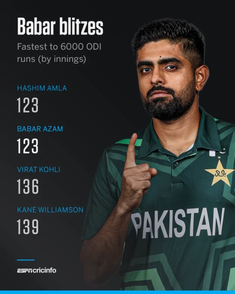 یوں بابراعظم نے بھارتی بلے باز ویرات کوہلی کا ریکارڈ توڑ دیا اور وہ جنوبی افریقہ کے بلے باز ہاشم آملہ کے ہم پلہ آگئے ہیں، دونوں کھلاڑیوں نے 123 اننگز میں 6 ہزار رنز مکمل کیے۔