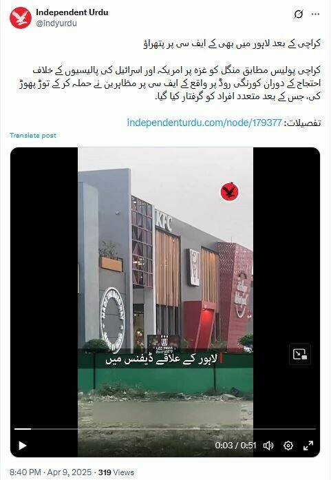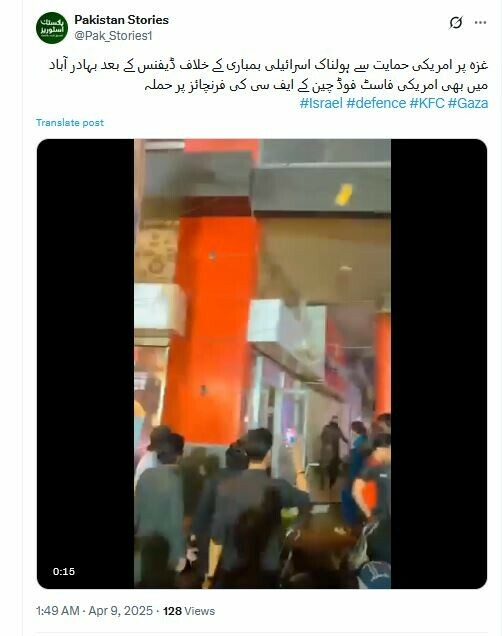 اسی طرح، کراچی کے علاقے بہادرآباد میں بھی فاسٹ فوڈ چین ’کے ایف سی‘ پر حملہ کیا گیا جس کی ویڈیوز کل سے سوشل میڈیا پر وائرل ہورہی ہیں۔