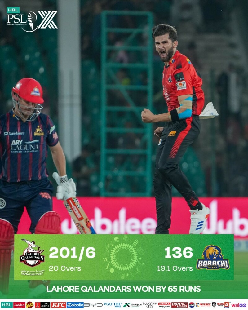 پاکستان سپر لیگ (پی ایس ایل) کے دسویں ایدیشن کے چھٹے میچ میں لاہور قلندرز نے کراچی کنگز کو 65 رنز سے شکست دے کر ٹورنامنٹ میں مسلسل دوسری فتح حاصل کرلی۔