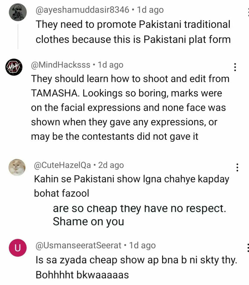 بعض صارفین نے شو کے فارمیٹ کو بھی آٓڑے ہاتھوں لیتے ہوئے اسے فضول شو قرار دیا جب کہ کچھ مداحوں نے نشاندہی کی کہ ماڈلز کو روایتی لباس پہنایا جاتا تو شو پاکستانی لگتا، اب کسی طرح بھی شو پاکستانی نہیں لگ رہا۔