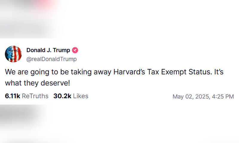 امریکی صدر ڈونلڈ ٹرمپ نے کہا ہے کہ ان کی انتظامیہ ہارورڈ یونیورسٹی سے اس کی ٹیکس سے مستثنیٰ حیثیت ختم کرنے کے لیے اقدامات کرے گی۔