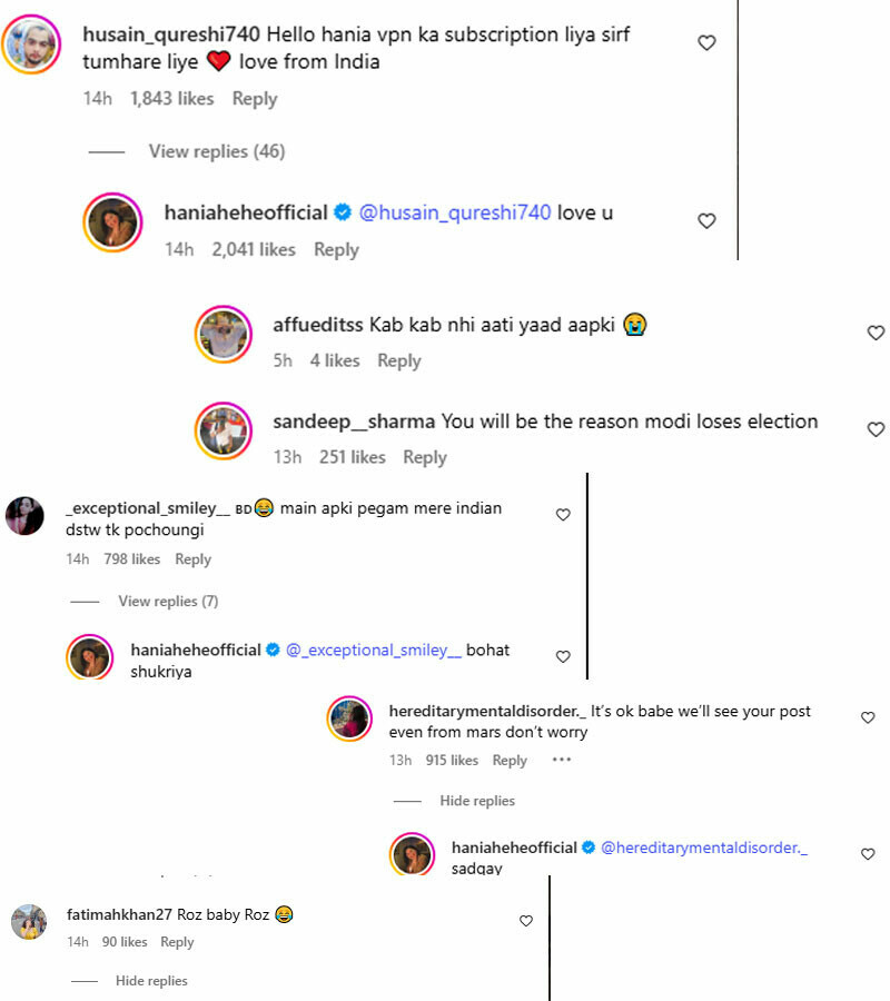 ایک بھارتی مداح نے کمنٹ کیا کہ وہ اپنے بھارتی دوستوں کو اداکارہ کا پیغام پہنچائیں گی، جس پر ہانیہ عامر نے ان کا شکریہ بھی ادا کیا۔