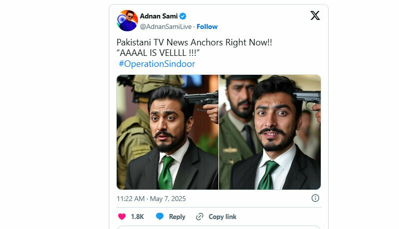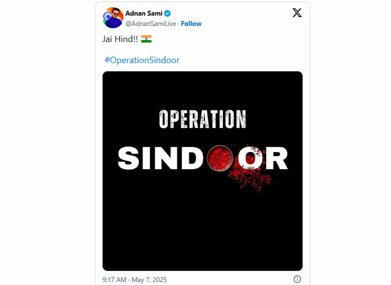 عدنان سمیع خان نے اپنی ٹوئٹس میں سے ایک ٹوئٹ میں ’جے ہند‘ کا نعرہ لگاتے ہوئے ’آپریشن سندور‘ کا ہیش ٹیگ استعمال کیا جب کہ دوسری ٹوئٹ میں انہوں نے پاکستانی ٹی وی اینکرز کا مذاق بھی اڑایا۔