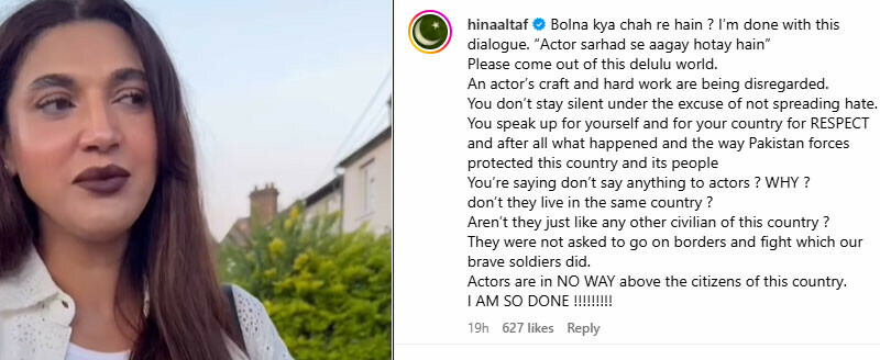 حنا الطاف نے لکھا کہ کسی بھی فنکار کی جانب سے اپنے ملک کی حفاظت اور ملک سے محبت کے لیے بات کرنا جرم نہیں، وہ اپنے وطن کے لیے بات کر سکتے ہیں۔