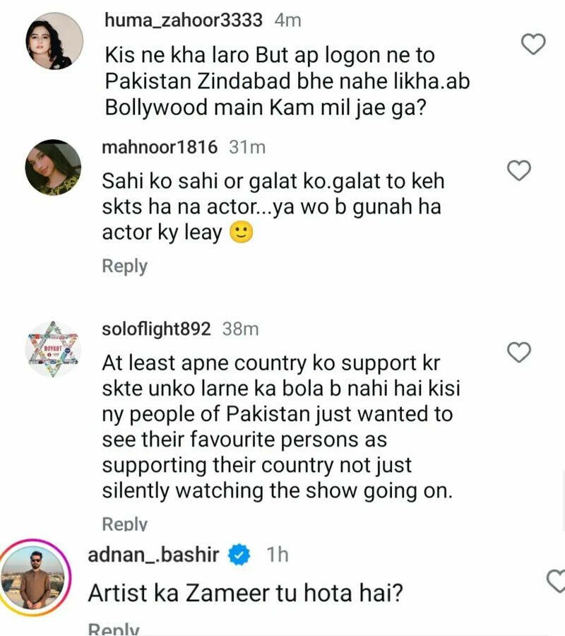 انہوں نے لکھا کہ اداکاروں کو سرحد پر فوج کی طرح لڑنے کا نہیں کہا جا رہا لیکن اداکار اپنے ملک کے دفاع کے لیے عام شہریوں کی طرح بات کر سکتے ہیں۔