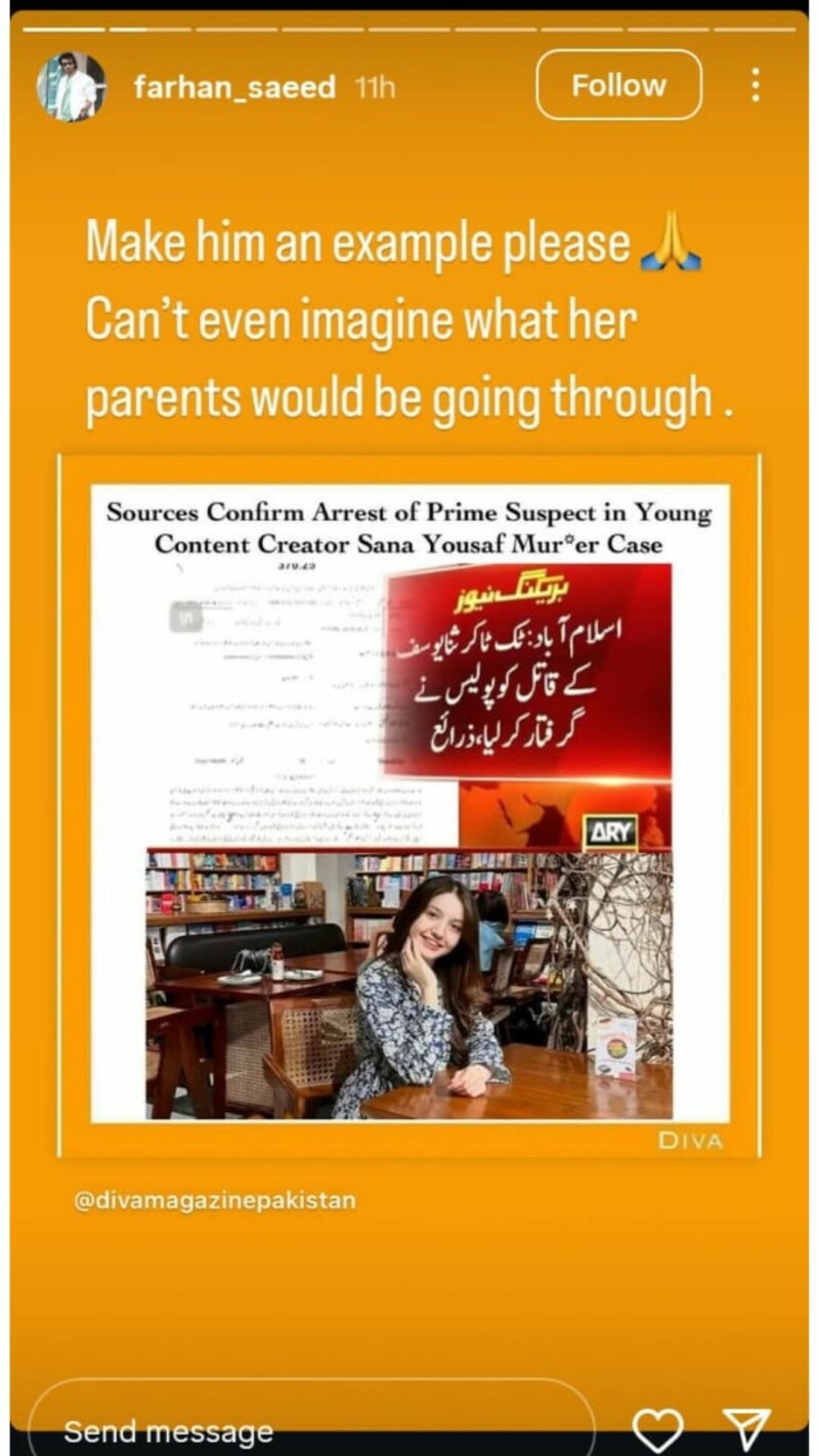 اداکار و گلوکار فرحان سعید نے انسٹاگرام پر اپیل کی کہ مجرم کو سخت سزا دی جائے تاکہ وہ دوسروں کے لیے نشانِ عبرت بنے۔