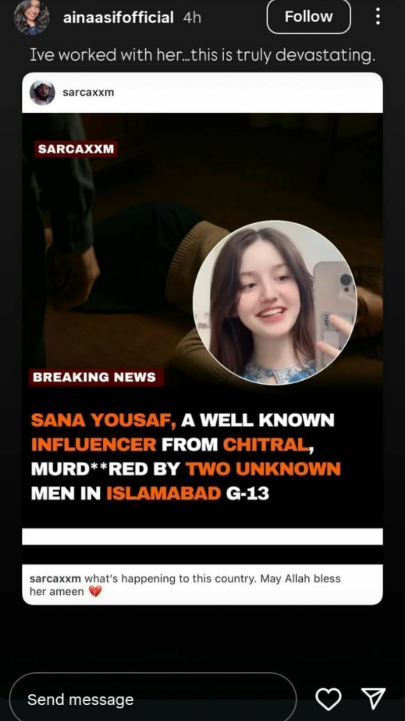 اداکارہ عینا آصف جو ماضی میں ثنا یوسف کے ساتھ کام کرچکی ہیں نے بھی اس واقعے پر افسوس کا اظہار کرتے ہوئے اسے ایک المناک سانحہ قرار دیا۔