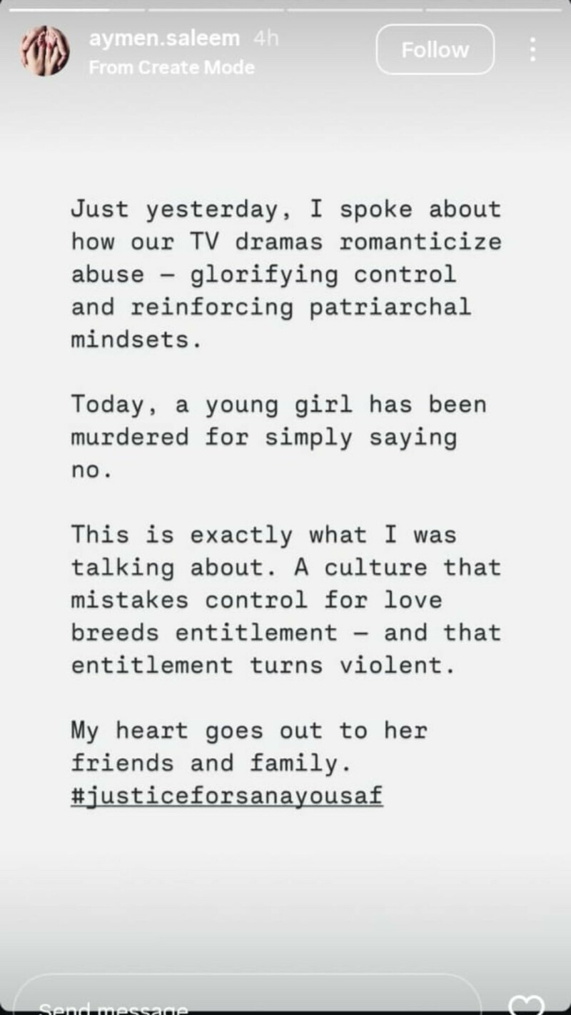 اداکارہ ایمن سلیم نے بھی واقعے پر افسوس کا اظہار کرتے ہوئے لکھا کہ کل ہی میں نے بات کی تھی کہ ہمارے ٹی وی ڈرامے کس طرح تشدد کو رومانوی بناتے ہیں اور آج، ایک نوجوان لڑکی کو صرف ’نہ‘ کہنے کی وجہ سے قتل کر دیا گیا، یہی وہ مسئلہ ہے جس کی طرف میں اشارہ کررہی تھی۔
