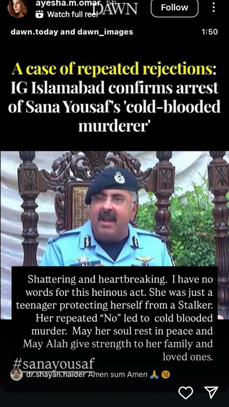 اداکارہ عائشہ عمر نے لکھا کہ اس واقعے پر گہرا دکھ ہے، الفاظ نہیں مل رہے، ایک لڑکی کو صرف ’نہ‘ کہنے پر قتل کر دیا گیا، اللہ تعالیٰ اس کے اہلِ خانہ کو صبر عطا فرمائے۔