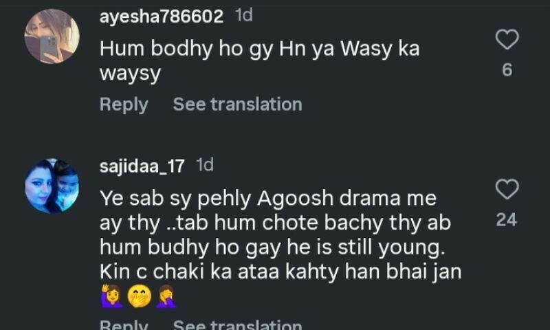 ایک صارف نے لکھا کہ اداکار نے جب پہلا ڈراما کیا تھا، میں چھوٹی بچی تھی، اب بوڑھی ہوگئی ہوں لیکن یہ ابھی بھی جوان ہیں، آخر کون سی چکی کا آٹا کھاتے ہیں؟