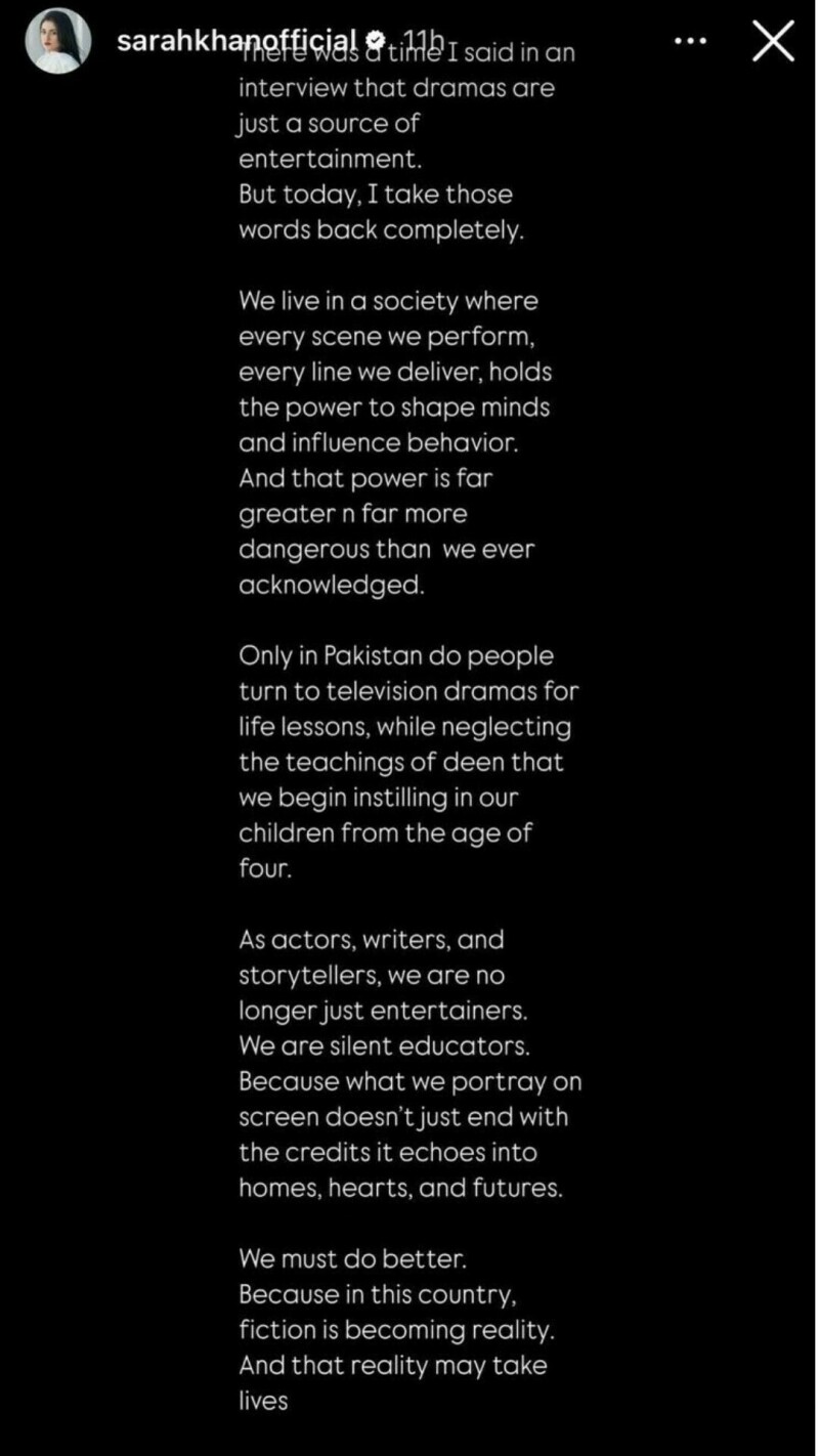 انہوں نے لکھا کہ کہیں نہ کہیں ہمارے ڈراموں سے اصل مفہوم کھوگیا ہے اور اب ہمیں سچائی، انصاف اور ذمہ داری کے ساتھ ڈراموں کو دوبارہ لکھنا ہوگا۔