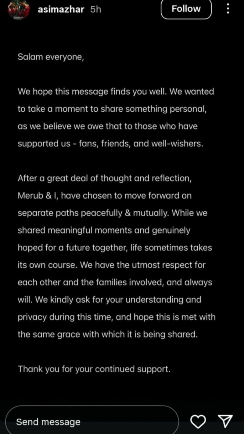 مزید برآں، عاصم اظہر کی جانب سے شیئر کی گئی اِس پوسٹ کے بعد، انہوں نے اور میرب علی نے ایک دوسرے کو انسٹاگرام پر اَن فالو کردیا ہے۔