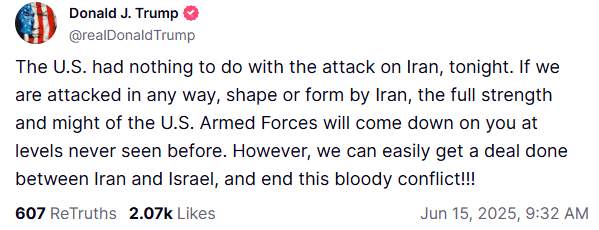 امریکی صدر ڈونلڈ ٹرمپ نے اپنے ٹرتھ سوشل پر جاری کردہ بیان میں کہا کہ امریکا کا آج رات ایران پر ہونے والے حملے سے کوئی تعلق نہیں ہے۔