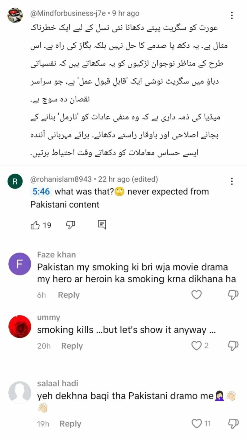 ناظرین کا کہنا ہے کہ ایسے مناظر نوجوان نسل کو منفی پیغام دیتے ہیں اور انہوں نے مطالبہ کیا کہ ڈراما انڈسٹری کو ذمہ داری کا مظاہرہ کرنا چاہیے۔