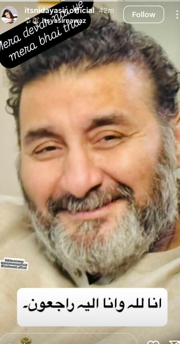 یاسر نواز کی اہلیہ و میزبان ندا یاسر نے بھی انسٹا اسٹوری میں وقار نواز کی تصویر شیئر کرتے ہوئے لکھا کہ میرا دیور نہیں میرا بھائی تھا۔