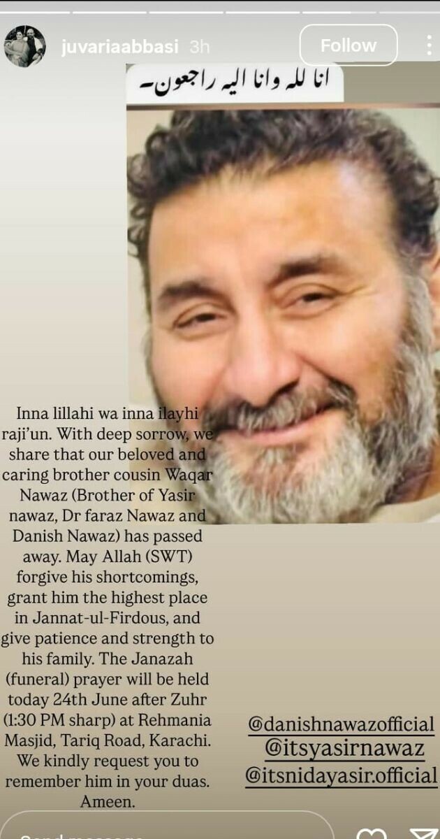اداکارہ جویریہ عباسی نے بھی یاسر نواز کے بھائی وقار نواز کے انتقال کی خبر شیئر کرتے ہوئے مرحوم کی مغفرت کے لیے دعا کی۔