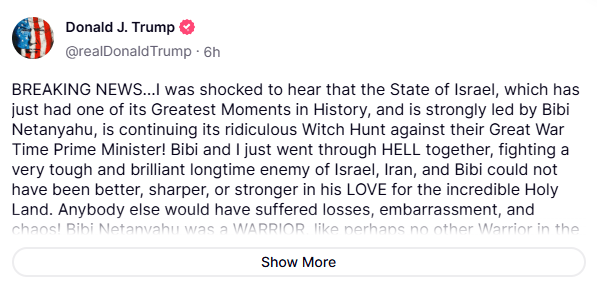 امریکی صدر ٹرمپ نے اپنی سوشل میڈیا ویب سائٹ ’ٹروتھ سوشل‘ پر ایک طویل پیغام میں لکھا کہ ’مجھے یہ جان کر شدید حیرت ہوئی کہ اسرائیل، جس نے حالیہ دنوں میں اپنی تاریخ کے عظیم ترین لمحات میں سے ایک کا مشاہدہ کیا اور جسے بی بی (نیتن یاہو کی عرفیت) جیسے مضبوط رہنما کی قیادت حاصل ہے، وہ اپنے جنگی وقت کے عظیم وزیر اعظم کے خلاف یہ مضحکہ خیز سیاسی انتقام جاری رکھے ہوئے ہے‘۔