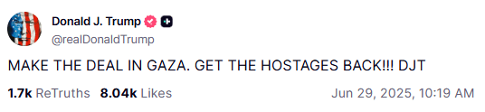 امریکی صدر ڈونلڈ ٹرمپ نے اپنے سوشل میڈیا پلیٹ فارم ’ٹروتھ سوشل‘ پر پوسٹ میں لکھا کہ ’غزہ میں معاہدہ کرو، یرغمالیوں کو واپس لاؤ‘۔