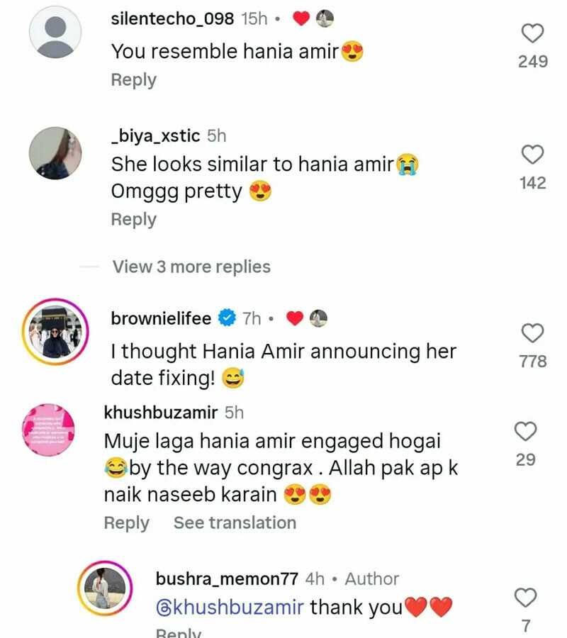 جہاں سوشل میڈیا صارفین نے ہانیہ عامر کی ہم شکل کی تعریفیں کیں، وہیں بعض افراد نے تبصرے کیے کہ انہیں خاتون کی ویڈیو دیکھتے ہوئے چند لمحوں کے لیے ایسا محسوس ہوا کہ اداکارہ نے منگنی کرلی۔