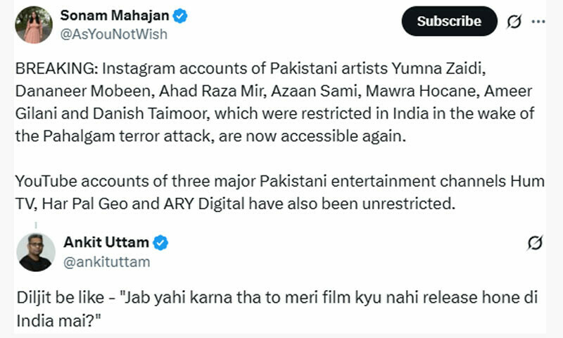 حیران کن طور پر بھارت میں ایسے وقت میں پاکستانی شخصیات کے اکاؤنٹس بحال کیے گئے ہیں جب کہ ہانیہ عامر کی بھارتی پنجابی فلم ’سردار جی تھری‘ حال ہی میں بھارت کے علاوہ دیگر ممالک میں ریلیز کی گئی ہے۔
